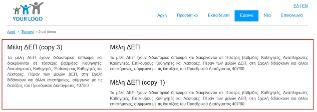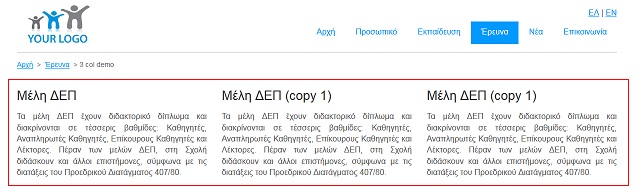 3. Μορφή 3 - Αποτελείται από 3 στήλες (συμμετρικές σε πλάτος) προβολής των περιεχομένων στην περιοχή MAIN CONTENT του template (βλέπε Εικόνα 1 ). Παράδειγμα σελίδας της οποίας το περιεχόμενο προβάλλεται στις 3 αυτές στήλες φαίνεται στην εικόνα που ακολουθεί.