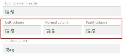 Προκειμένου να αναθέσετε σε μία σελίδα (μέσα από το περιβάλλον διαχείρισης του Typo3) την παραπάνω μορφή περιεχομένου (3 συμμετρικές στήλες), από το δέντρο των σελίδων επιλέξτε την σελίδα που θέλετε (σε page mode) και στη συνέχεια πατήστε Edit. Από τις διαθέσιμες καρτέλες επιλέξτε την καρτέλα Appearance και μετά επιλέξτε την κατάλληλη μορφή περιεχομένου από το πεδίο Backend Layout (this page only). Στην προκείμένη περίπτωση επιλέξτε TMPL1 Main 3 column και στη συνέχεια αποθήκευση και κλείσιμο. Ο διαχειριστής που θα επιχειρήσει να εισάγει περιεχόμενο στη συγκεκριμένη σελίδα θα έχει πλέον στη διάθεσή του τις στήλες που φαίνονται στην παρακάτω εικόνα.